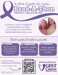 In honor of Judy Hufnal, who passed away from GIST Cancer and in support of all families affected by GIST, a Read-A-Thon Fundraiser has been set up in hope for a future with better treatments and a cure. Please be generous and donate so that we can save lives from this deadly cancer.